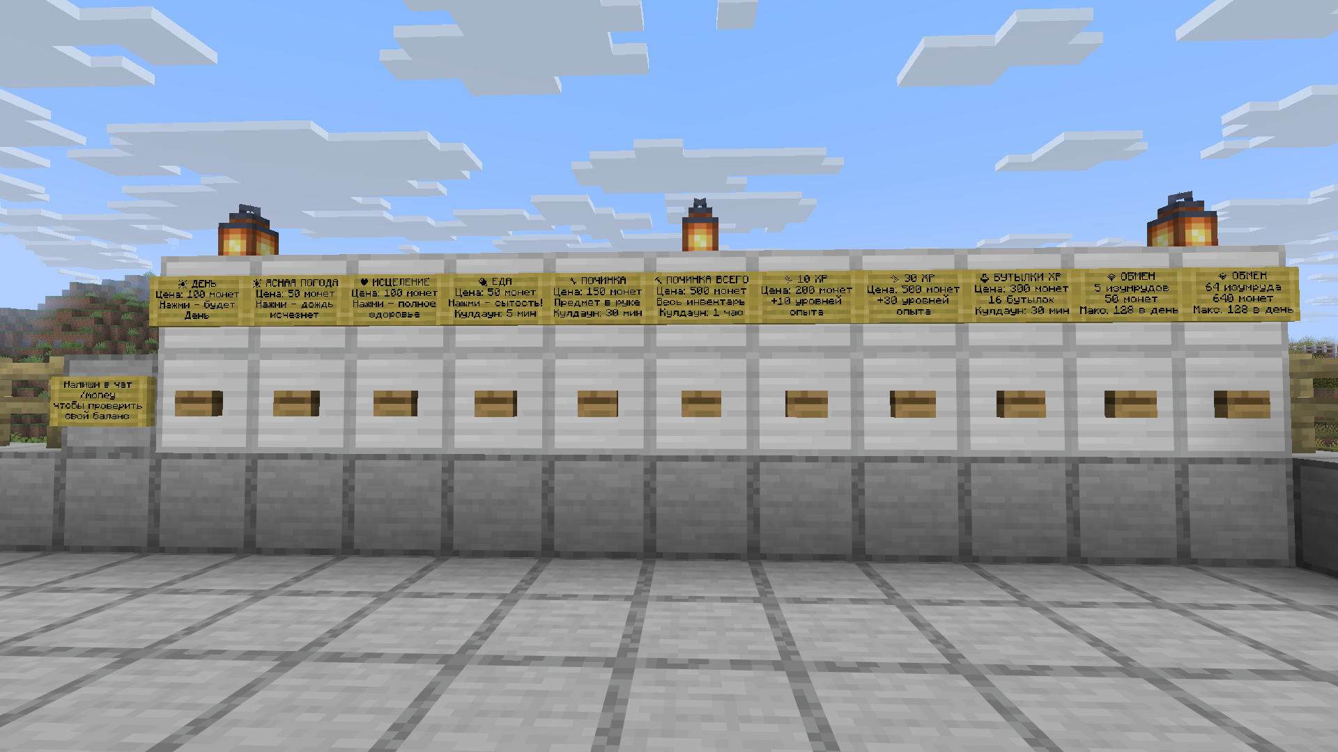 Плагин позволяет игрокам покупать различные серверные возможности через обычные кнопки на спавне. Нажал кнопку — деньги списались — команда выполнилась. Всё просто и наглядно!