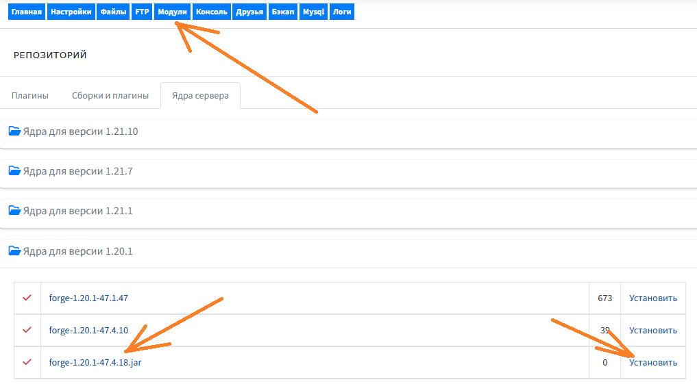 Скачайте с официального сайта установщик Forge ( forge-1.20.1-47.4.18-installer.jar ) на свой компьютер. Запустите его - в указанную папку распакуется сервер Forge. Затем загрузите содержимое этой папки на хостинг и в настройках выберите ядро «Без ядра (только для новых версий Forge)».