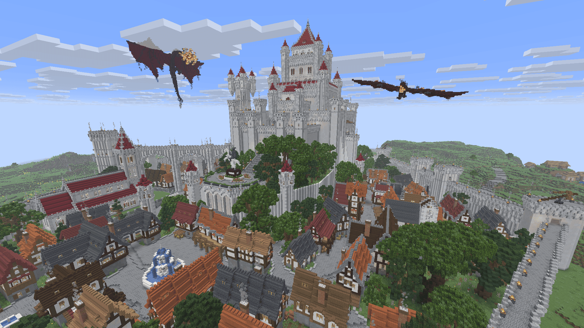 Это большая средневековая крепость, построенная на равнине у воды. В ней есть высокие белые стены, башни с красными крышами и город внутри с рынком, домами и улицами.
